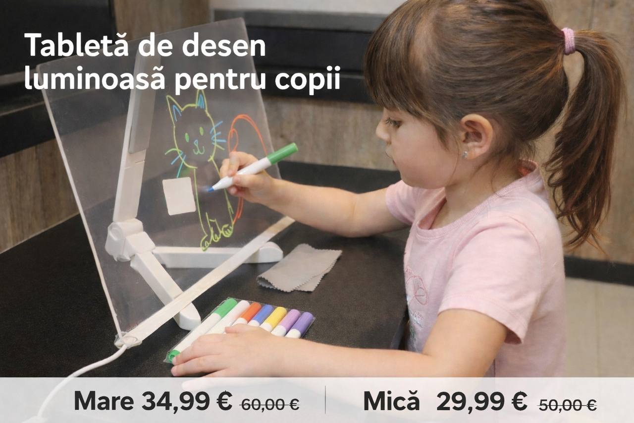 Da, tableta noastră luminoasă este concepută special pentru copii. Este fabricată din materiale sigure, fără substanțe nocive, și are finisaje netede pentru a evita orice risc de accident. Ca pentru orice activitate, supravegherea unui adult este recomandată pentru cei mai mici.