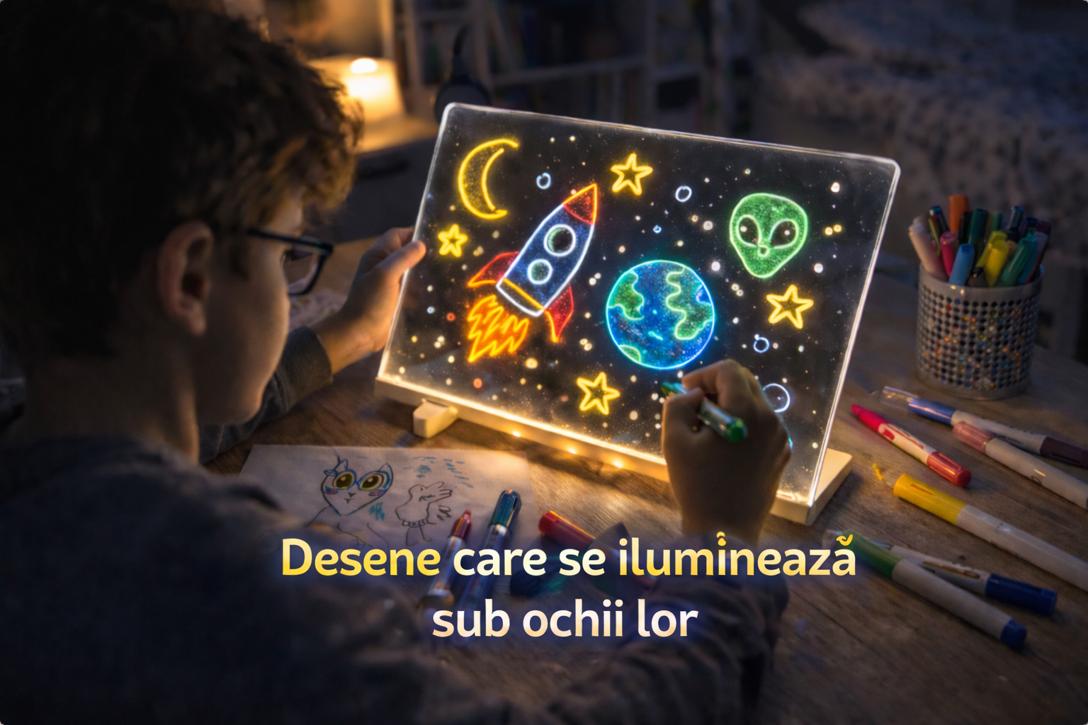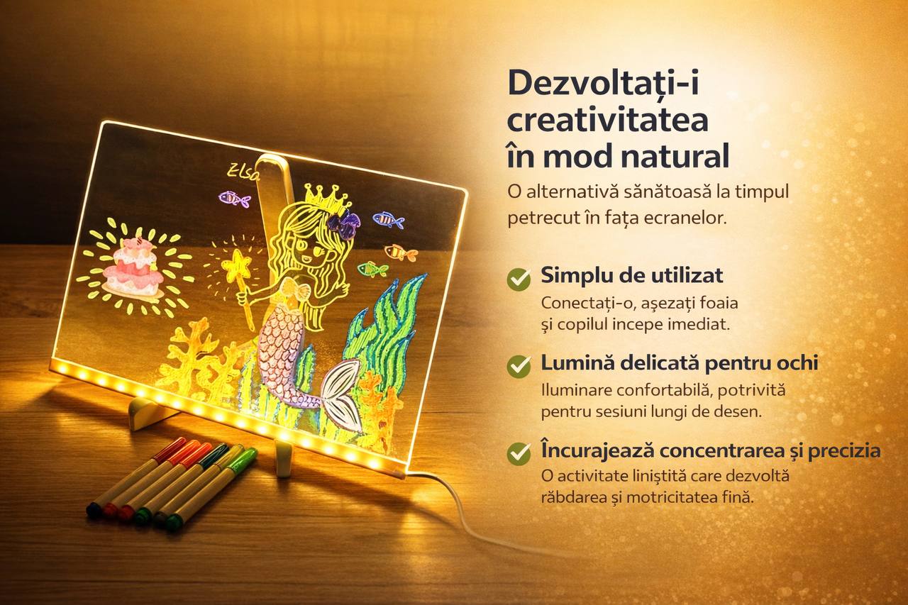 Datorită iluminării LED inteligente și sigure, tableta noastră evidențiază fiecare linie și dă viață instant creațiilor copilului dumneavoastră.