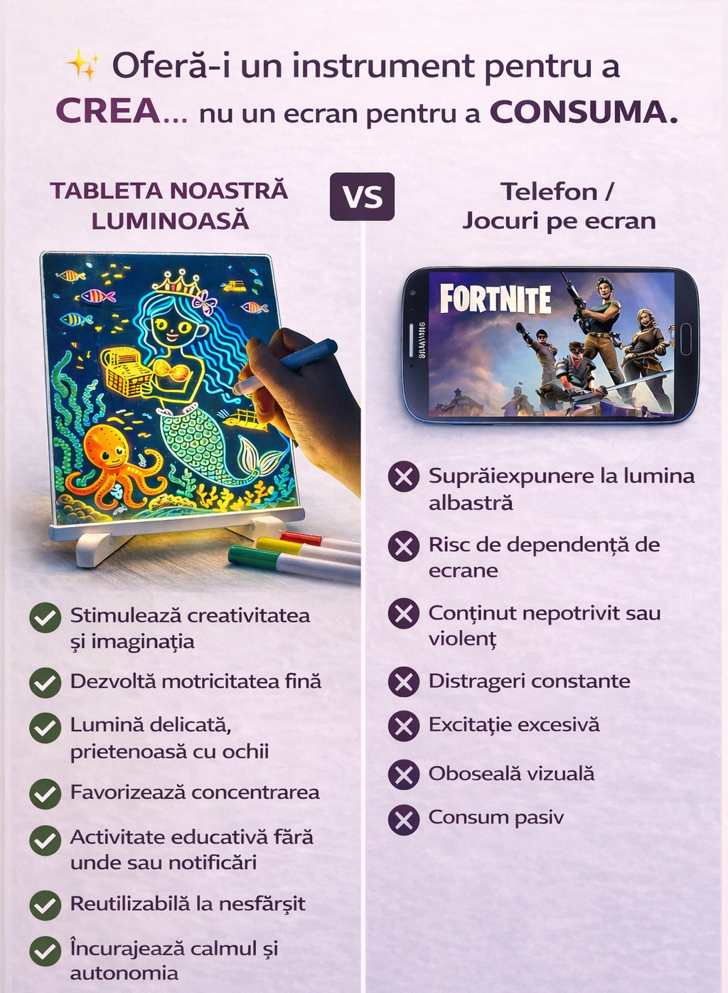 Experții recomandă limitarea timpului petrecut în fața ecranelor de către copii. Tableta noastră luminoasă este o alternativă distractivă și inteligentă.