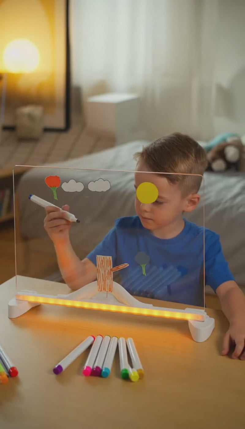 Suprafața luminoasă este fascinantă și îi stimulează creativitatea. Culorile sunt vii, iar desenele sunt ușor de creat și de șters.